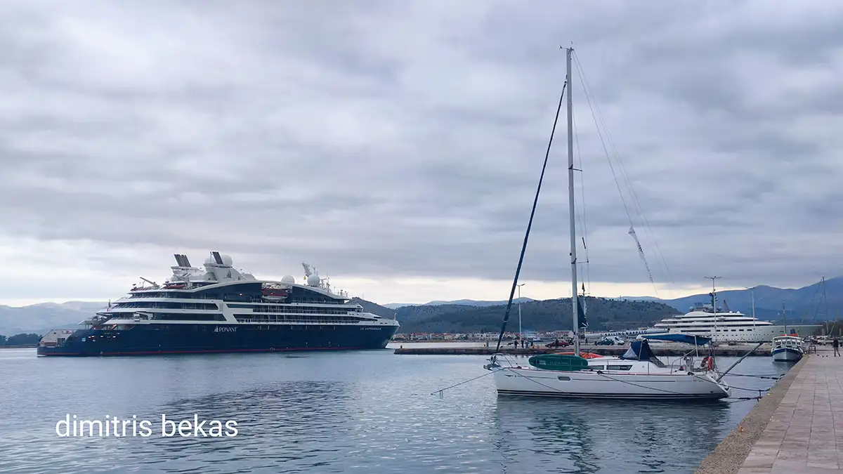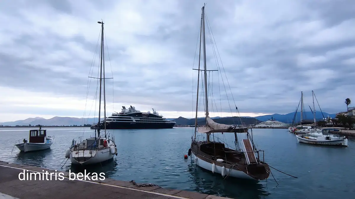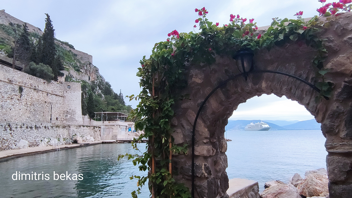 Οι φωτογραφίες του Δημήτρη Μπέκα αποτυπώνουν μοναδικά τη γαλήνια δύναμη της στιγμής. Από τη μία, ένα πολυτελές κρουαζιερόπλοιο ανοικτά του λιμανιού, με φόντο τα βουνά της Αργολίδας. Από την άλλη, το ιστορικό λιμάνι του Ναυπλίου με τις θαλαμηγούς και τα ιστιοπλοϊκά να «συνομιλούν» με τα κύματα.