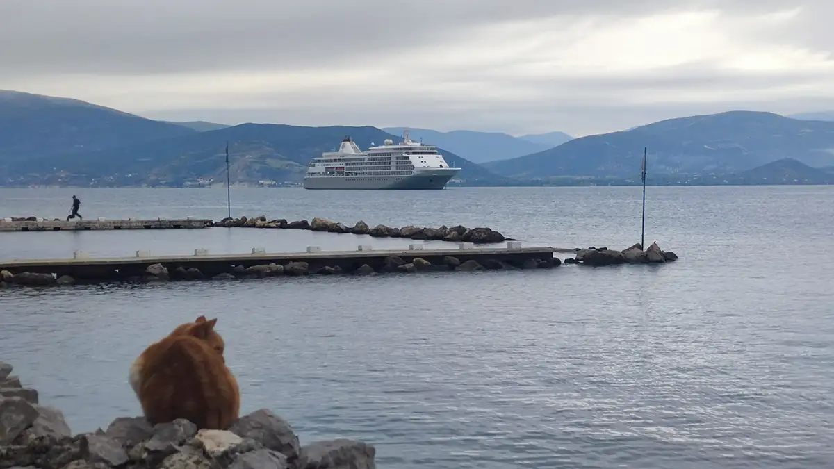 Η φθινοπωρινή θαλασσινή αύρα, τα ήσυχα νερά και οι πολυτελείς σιλουέτες των κρουαζιερόπλοιων συνθέτουν ένα σκηνικό που θυμίζει πίνακα ζωγραφικής.