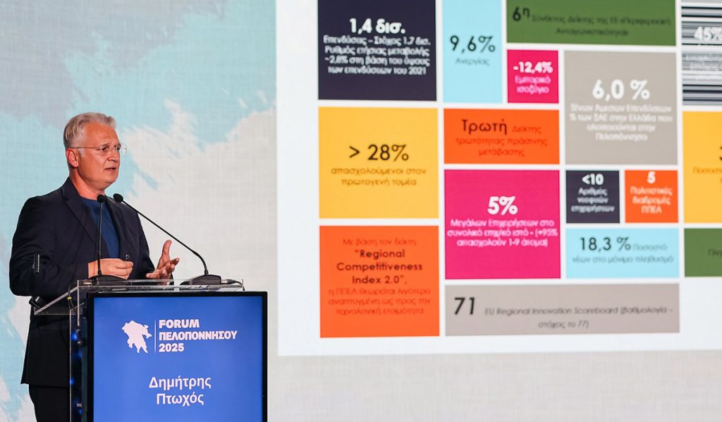 Στη συνέχεια, παρουσίασε την πραγματική εικόνα της Πελοποννήσου μέσα από κρίσιμους δείκτες όπως η ανταγωνιστικότητα και παραγωγικότητα, το αγροτικό δυναμικό, τα ελλειμματικά έργα άρδευσης και αντιπλημμυρικής προστασίας, καθώς και η αδύναμη παρουσία καινοτομίας και έρευνας. Όπως επεσήμανε, αυτή η αποτύπωση δεν γίνεται για να καταγράψει απλώς τα προβλήματα, αλλά για να καθοδηγήσει πολιτικές με πραγματικό και μετρήσιμο αποτέλεσμα.