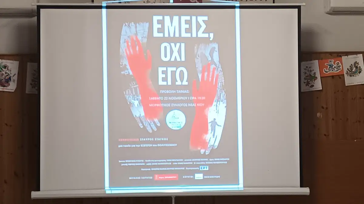 Με ιδιαίτερη επιτυχία πραγματοποιήθηκε στη Νέα Κίο η προβολή του ντοκιμαντέρ «Εμείς, όχι Εγώ», ένα έργο που φωτίζει τη Χούντα, το αντιδικτατορικό φοιτητικό κίνημα και κορυφώνεται στην εξέγερση του Πολυτεχνείου το 1973.