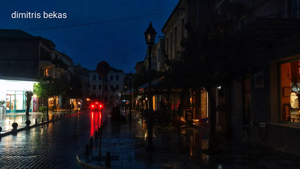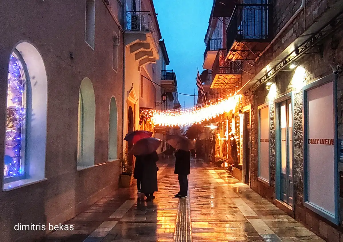 Την ίδια στιγμή, στην παλιά πόλη του Ναυπλίου, η βροχή μετέτρεπε τα σοκάκια σε λαμπερές, υγρές μικρές λεωφόρους. Οι φωτογραφίες του Δημήτρη Μπέκα αποτυπώνουν με θαυμαστή ευκρίνεια αυτή τη μαγεία: οι βρεγμένες πλάκες της παλιάς πόλης αντανακλούν τα φώτα των καταστημάτων και τις χρωματιστές ομπρέλες των περαστικών. Τα ανθισμένα μπαλκόνια στάζουν σταγόνες, ενώ οι παραδοσιακές γειτονιές μοιάζουν σαν να βγήκαν από καρτ ποστάλ που ζωντάνεψε στη βροχή.
