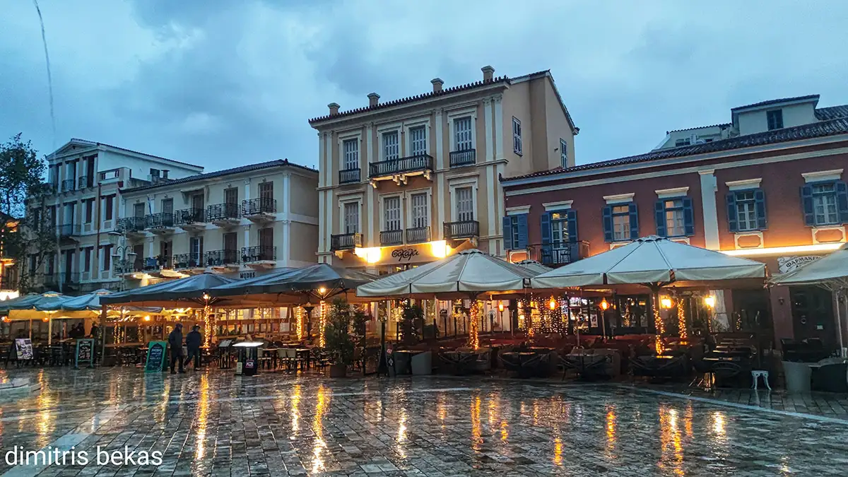 Στην πλατεία Συντάγματος, τα νωπόστρωτα μάρμαρα λαμπυρίζουν κάτω από τα ζεστά φώτα των καφέ, ενώ λίγοι τολμηροί περιπατητές με ομπρέλες διασχίζουν την πλατεία, δημιουργώντας μικρές, ήσυχες ιστορίες μέσα στο φθινοπωρινό σκηνικό. Το παλιό Ναύπλιο μοιάζει να ανασαίνει αργά, σαν να απολαμβάνει τη βροχή που του δίνει μια άλλη, πιο εσωτερική ομορφιά.
