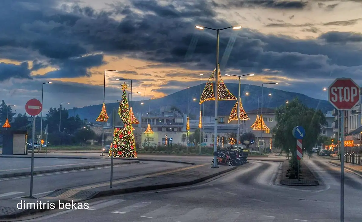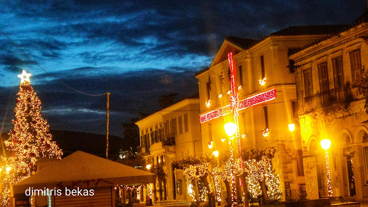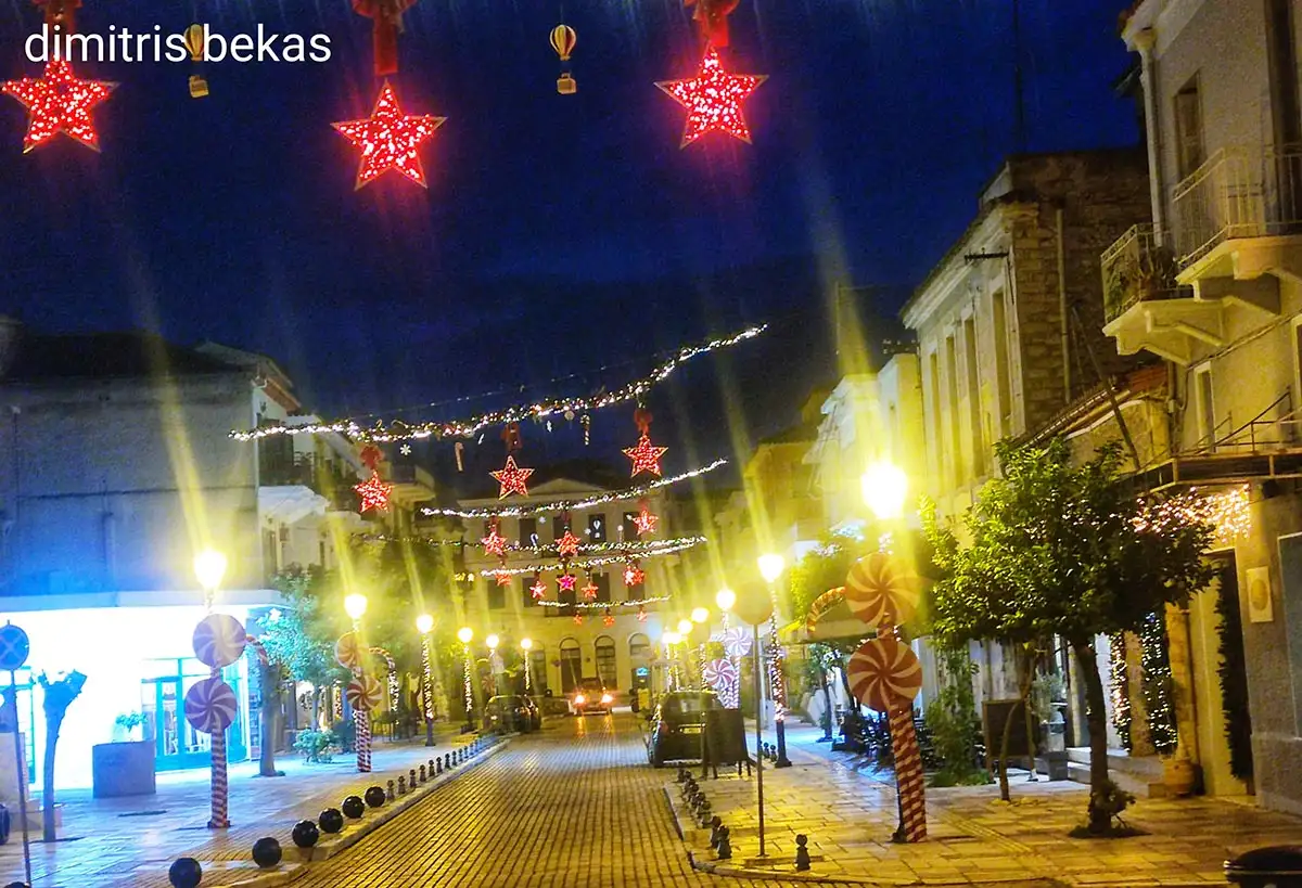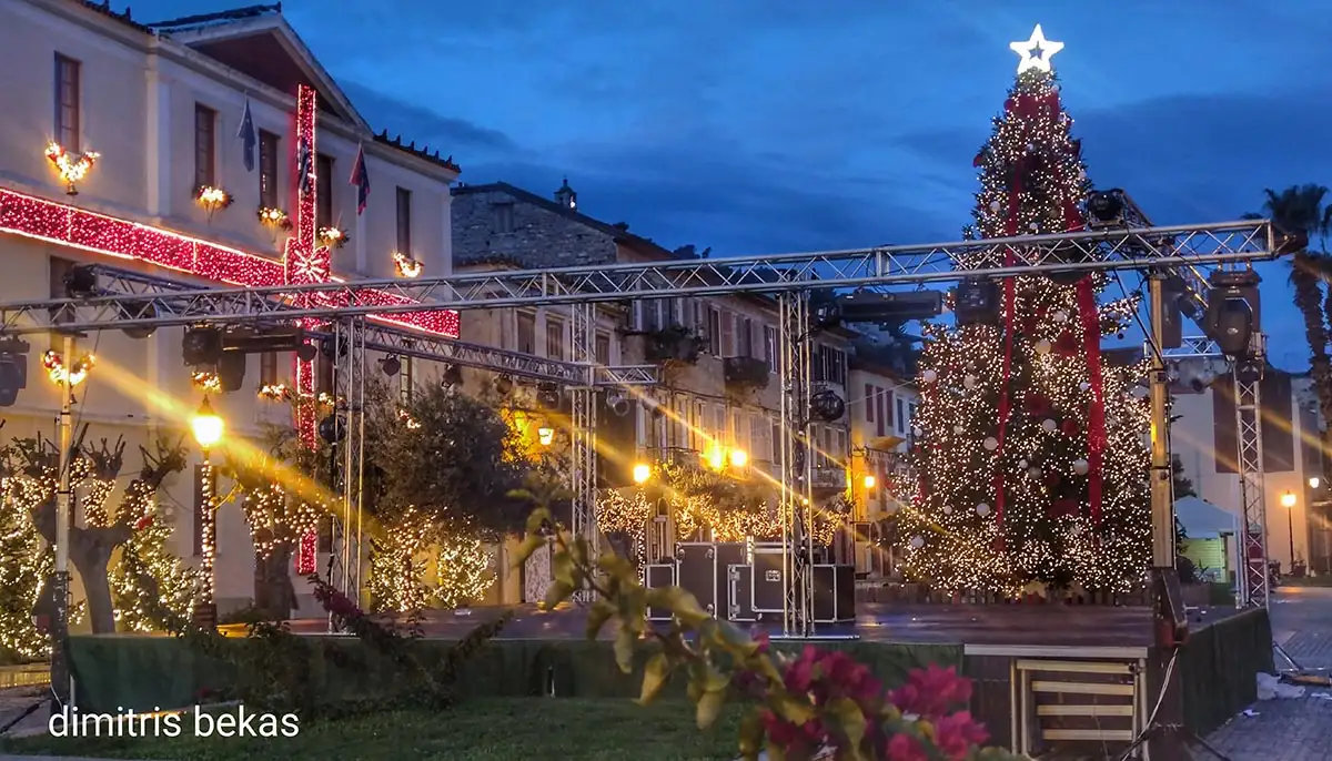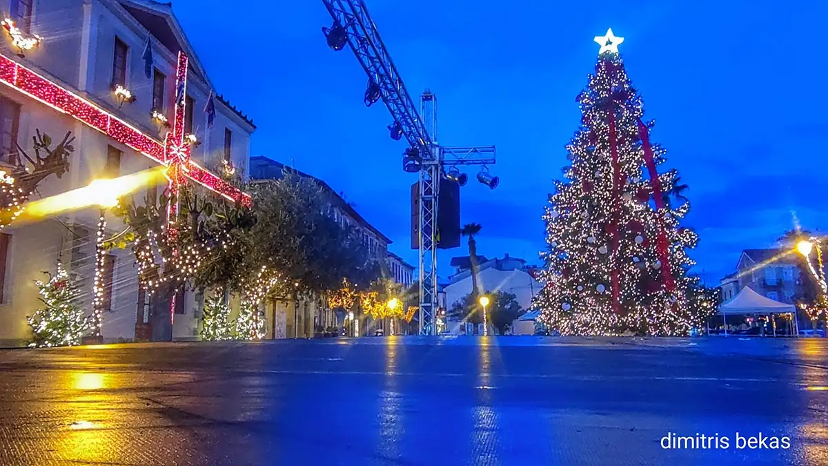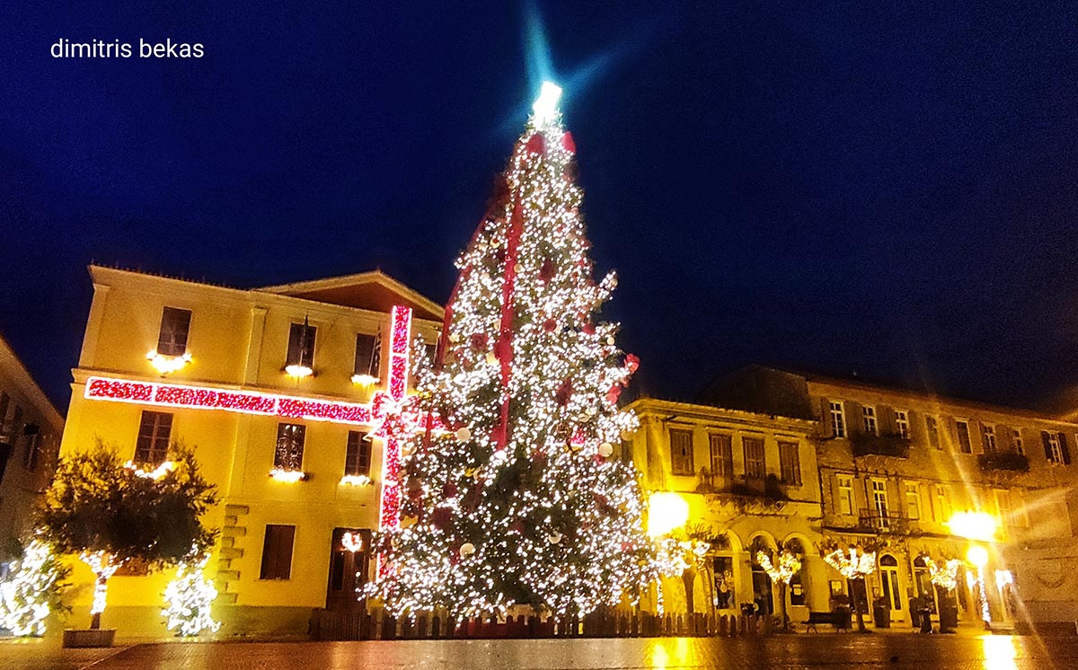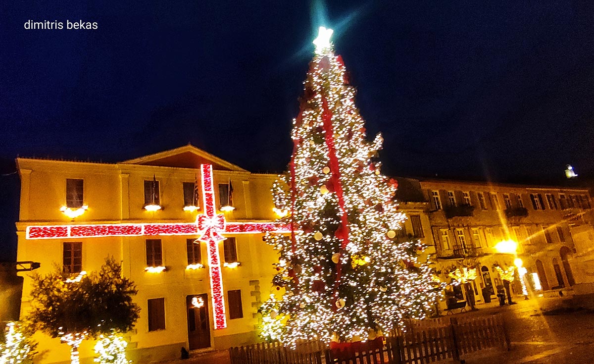 Η καρδιά της πόλης πάλλεται πλέον σε χριστουγεννιάτικους ρυθμούς. Το τεράστιο δέντρο στην Πλατεία Τριών Ναυάρχων, στολισμένο με χιλιάδες φωτάκια, δεσπόζει εντυπωσιακό και φωτίζει ολόκληρο το ιστορικό κέντρο. Δίπλα του, το νεοκλασικό κτήριο του Δημαρχείου «δένεται» με ένα εντυπωσιακό φωτεινό κόκκινο φιόγκο, μετατρέποντας το σημείο σε έναν από τους πιο φωτογραφισμένους χώρους των ημερών.