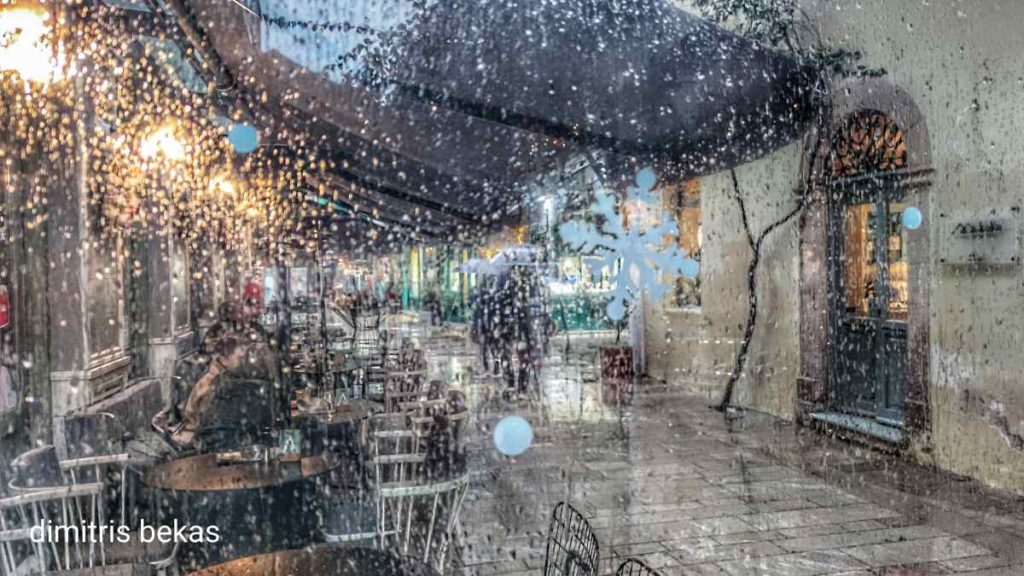Ο φωτογράφος Δημήτρης Μπέκας, γνωστός για τις ατμοσφαιρικές λήψεις του, μας μεταφέρει σε μια βροχερή ημέρα στην πόλη, όπου η υγρασία και τα σύννεφα προσθέτουν μια μυστηριώδη γοητεία στα μνημεία και τους δρόμους.