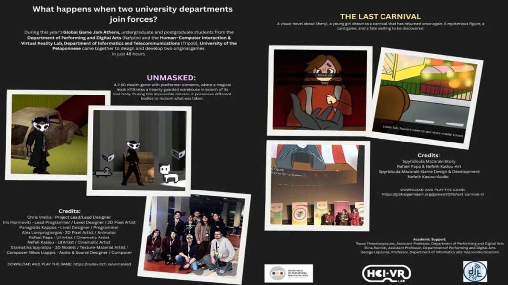 Μια δυναμική απόδειξη του υψηλού επιπέδου σπουδών και της δημιουργικότητας που χαρακτηρίζει το Πανεπιστήμιο Πελοποννήσου έδωσαν οι φοιτητές του ιδρύματος, συμμετέχοντας με αξιώσεις στον μεγαλύτερο παγκόσμιο διαγωνισμό δημιουργίας παιχνιδιών, το Global Game Jam 2026.