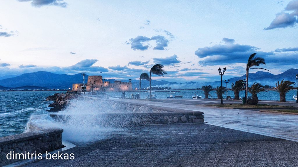 Όπως αποτυπώνεται γλαφυρά μέσα από τον φωτογραφικό φακό του Δημήτρη Μπέκα, ο ουρανός πάνω από το Ναύπλιο έχει βαρύνει, ενώ οι ισχυροί άνεμοι σαρώνουν την παραλιακή ζώνη και τα στενά της πόλης. Οι χαρακτηριστικές εικόνες αποδεικνύουν τη δυναμική των μετεωρολογικών συνθηκών που επικρατούν, αναγκάζοντας τους πολίτες να περιορίσουν τις μετακινήσεις τους.