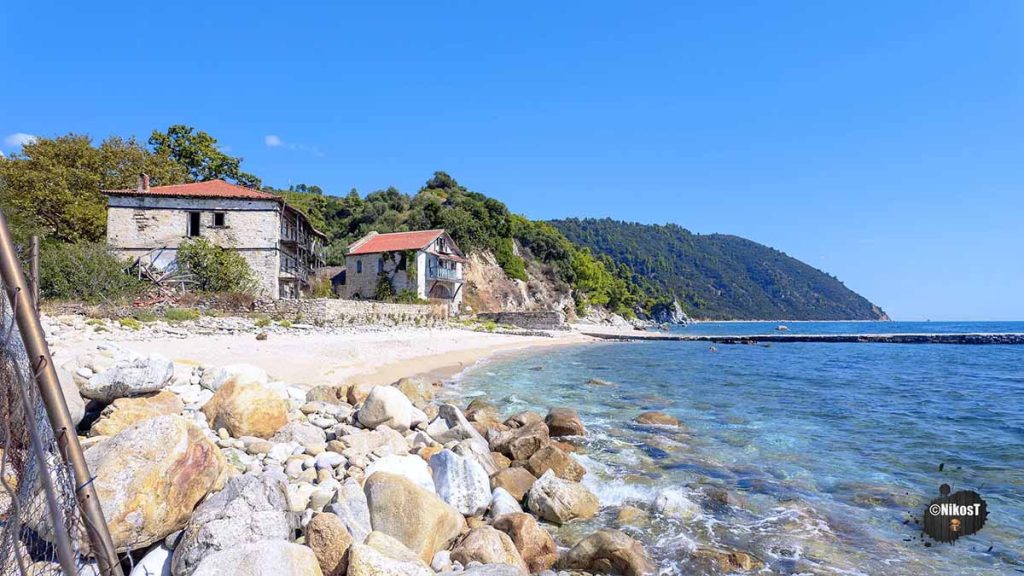 Η παραλία ξεχωρίζει για τα λευκά βότσαλα και την μοναδική θέα προς τον Άθωνα. Είναι ένα από τα πιο ιδιαίτερα τοπία της περιοχής και προσελκύει επισκέπτες που θέλουν να γνωρίσουν την ιδιαίτερη ατμόσφαιρα του τόπου.