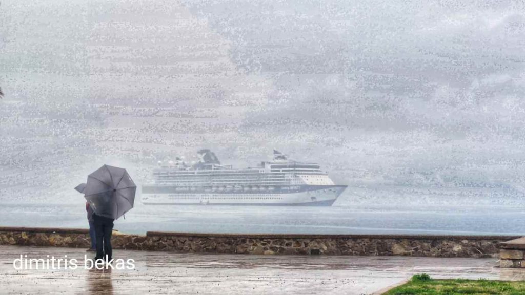 Η εικόνα από την παραλιακή ζώνη αποτυπώνει τις δύσκολες συνθήκες που επικρατούν, με την ορατότητα να είναι ιδιαίτερα περιορισμένη, ενώ η συνεχής βροχόπτωση δυσχεραίνει τις μετακινήσεις κατοίκων και επισκεπτών. Στο φόντο, πλοίο διασχίζει τον Αργολικό κόλπο μέσα σε πυκνή ομίχλη, αποτυπώνοντας τη σφοδρότητα των φαινομένων.