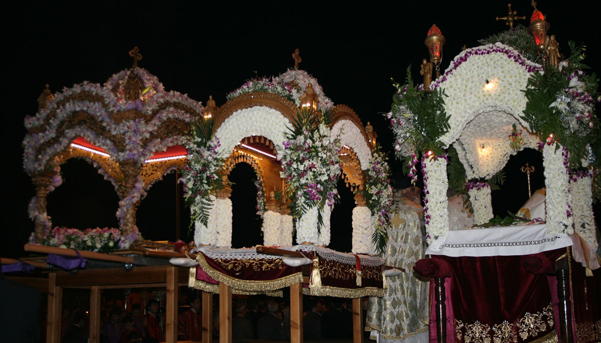Οι ιερείς, ψέλνοντας τα Εγκώμια του Επιταφίου Θρήνου, οδήγησαν τις πομπές στο προκαθορισμένο σημείο συνάντησης. Κάτω από τον νυχτερινό ουρανό, οι ανθοστόλιστοι Επιτάφιοι των πέντε κεντρικών ενοριών της πόλης συγκλίναν με απόλυτη αρμονία.