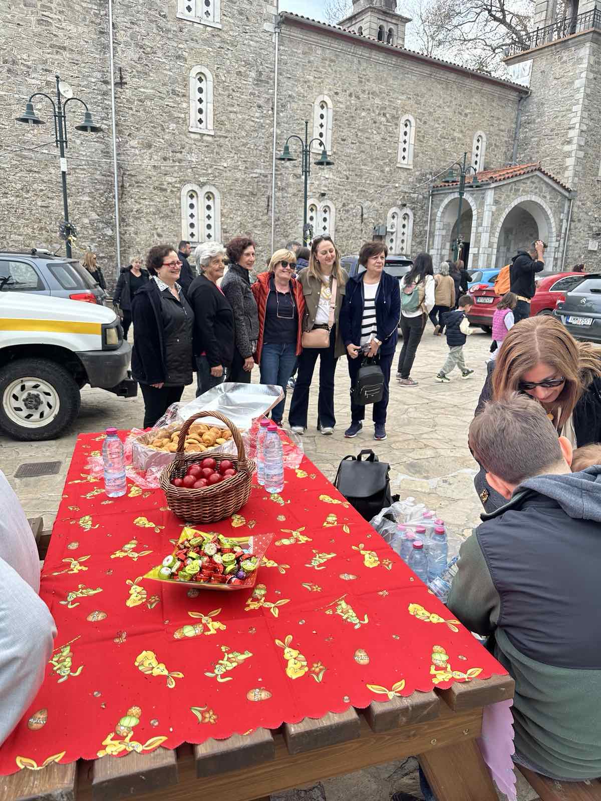 Ένα μεγάλο τραπέζι, στρωμένο με πασχαλινό κόκκινο τραπεζομάντηλο, στήθηκε στο κέντρο του χωριού, γεμάτο με καλάθια από κατακόκκινα αυγά, παραδοσιακά πασχαλινά κουλούρια και σοκολατάκια, προσφέροντας ένα ζεστό καλωσόρισμα σε μικρούς και μεγάλους.
