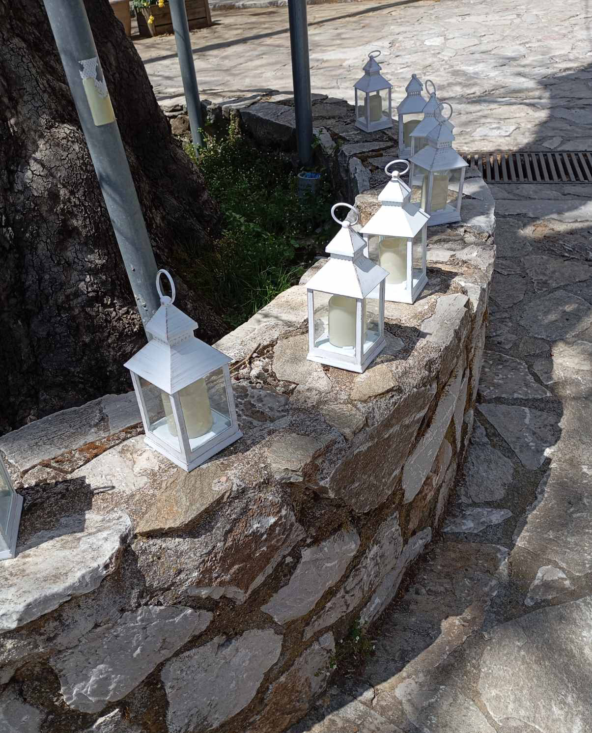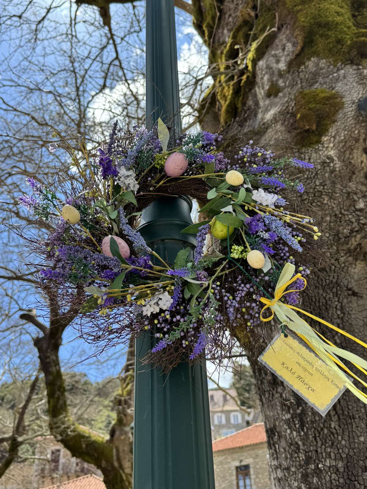 Πανέμορφα, χειροποίητα πασχαλινά στεφάνια με την υπογραφή και τις ευχές του Συλλόγου κοσμούν τις κολόνες, ενώ δεκάδες λευκά φαναράκια έχουν τοποθετηθεί κατά μήκος των παραδοσιακών πέτρινων τοιχίων. Μόλις πέσει το σκοτάδι, τα φαναράκια αυτά θα φωταγωγήσουν το χωριό, δημιουργώντας ένα μαγευτικό, κατανυκτικό σκηνικό.
